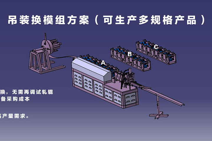 更换冷弯轧辊模组方案原理(lǐ)解析:通过更换冷弯轧辊模组来生产(chǎn)不同规格尺寸的冷弯型材,如上图A、B、C模组之间可(kě)互换(需要生产(chǎn)更多(duō)规格产(chǎn)品可(kě)定制更多(duō)模组),只需要把模组吊上冷弯主机平台,插上定位销再锁紧,即完成轧辊模组的更换,换上对应产(chǎn)品的切断模具(jù),然后在屏幕选择对应产(chǎn)品的生产(chǎn)模式,即可(kě)正常生产(chǎn)。